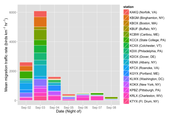 BirdCast predicted a large movement of birds in the greater New York City area on 11-12 September: first, nearly a week has passed of summer-like conditions in the greater New York City metropolitan area, preventing most exodus of migrants that is typical under more favorable conditions; second, a moderate to heavy flight of birds occurred in the periphery of upstate New York and parts of New England last night, indicating a number of birds in the immediate vicinities of the New York City metropolitan area (the image above shows some of these movements, and you can visit our analysis to read more about these flights); and finally, and most important, conditions were favorable for migration this evening, with northerly winds, clear skies, and substantially cooler temperatures than the past week. Read more...