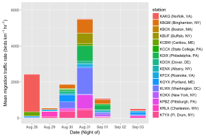 Welcome to our first fall 2017 installment of the traffic report describing northeast US nocturnal bird migration traffic rates, as calculated from a completely automated pipeline of algorithms. The images you see in Traffic Reports present the migration traffic rate (MTR), direction of bird movement, and speed of bird movement. See our first report or scientific paper for more information […] Read more...