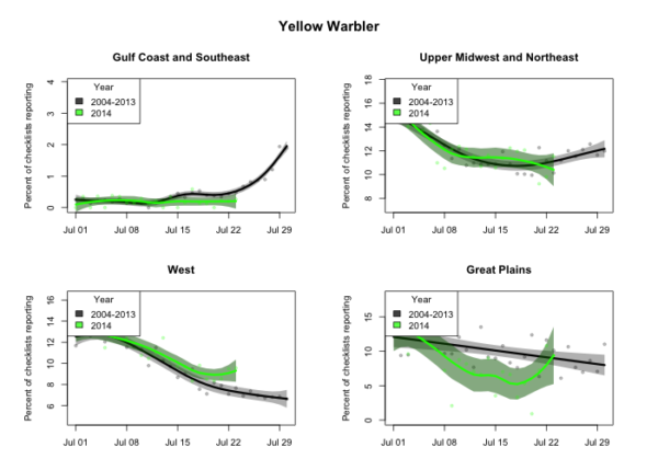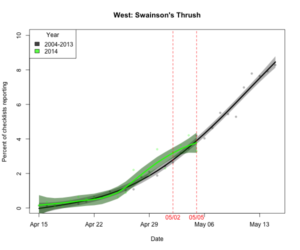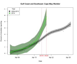 This week we highlight species on the move over the past weekend in the Southeastern US, including a number reported in frequencies substantially in advance of the 2004-2013 average (like Swainson’s and Wood Thrushes, Black-throated Blue and Cape May Warblers, Rose-breasted Grosbeak, and Scarlet Tanagers). Of course, not all species are moving in advance of the average […] Read more...